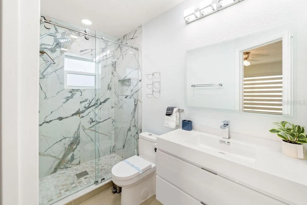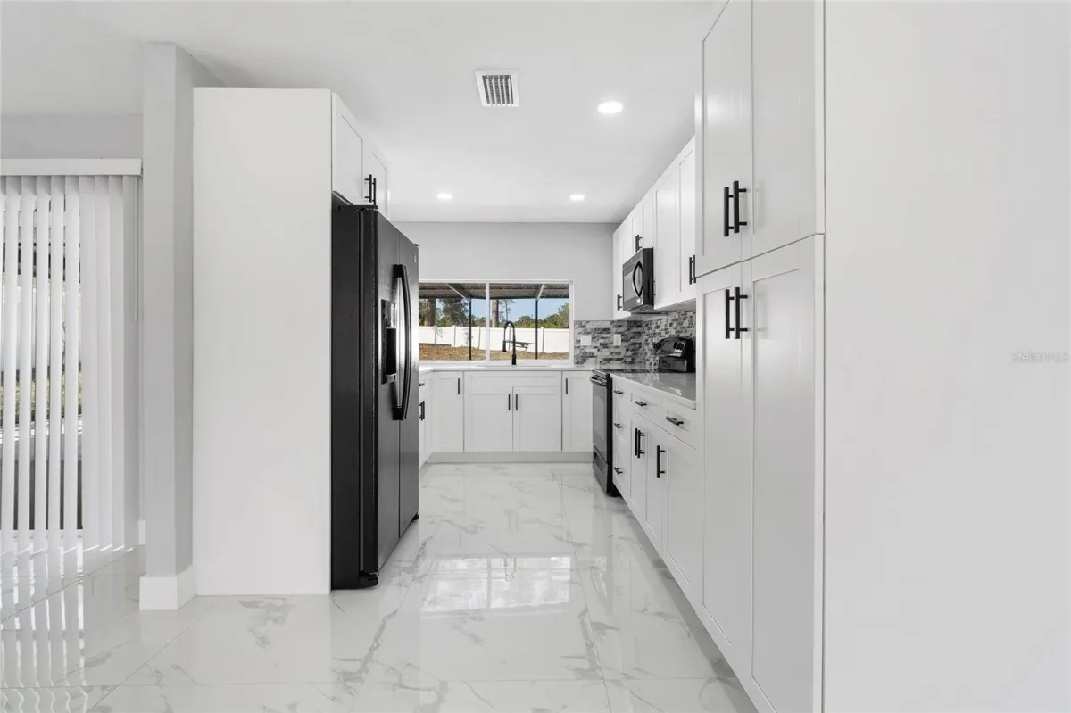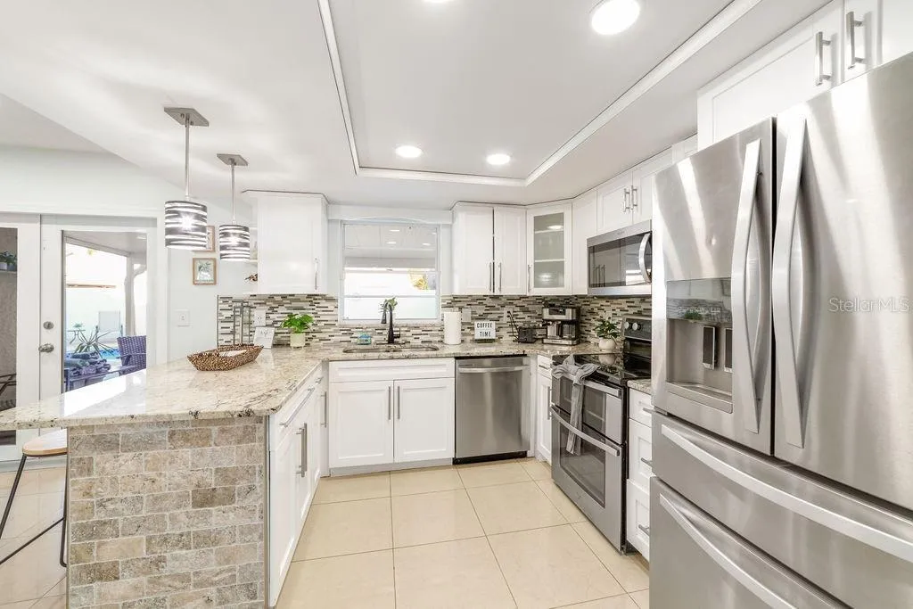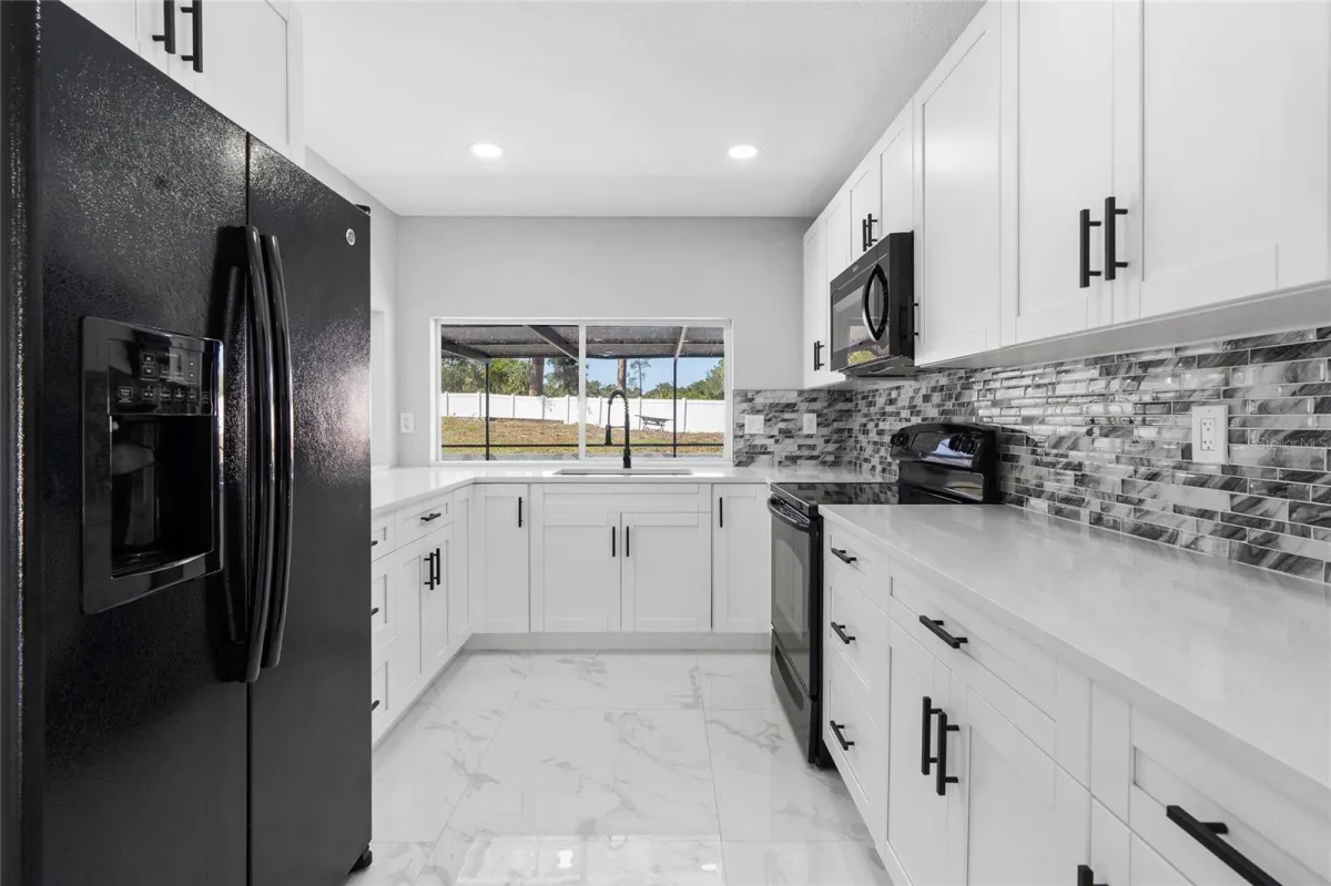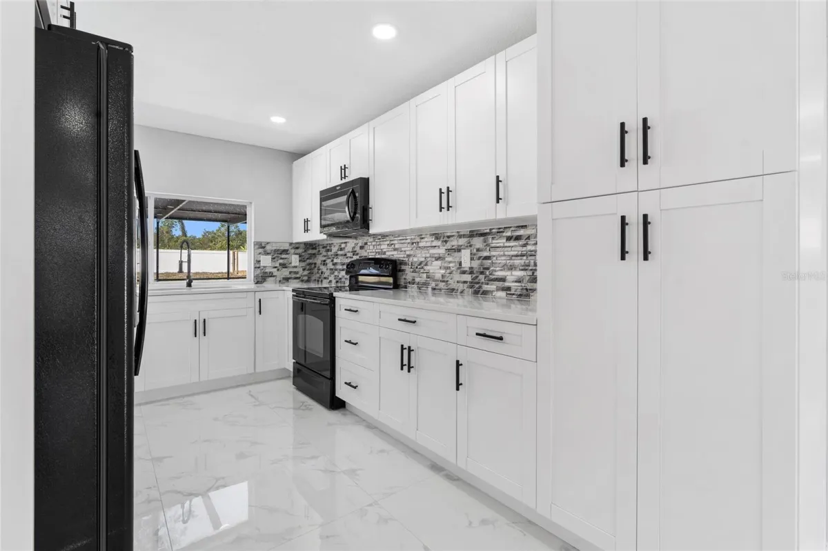 Beautifully remodeled, this residence blends modern elegance with classic charm. The open layout features marble-style floors, neutral tones, and recessed lighting throughout. The chef-inspired kitchen showcases white shaker cabinets, quartz countertops, a tile backsplash, and black stainless appliances.
